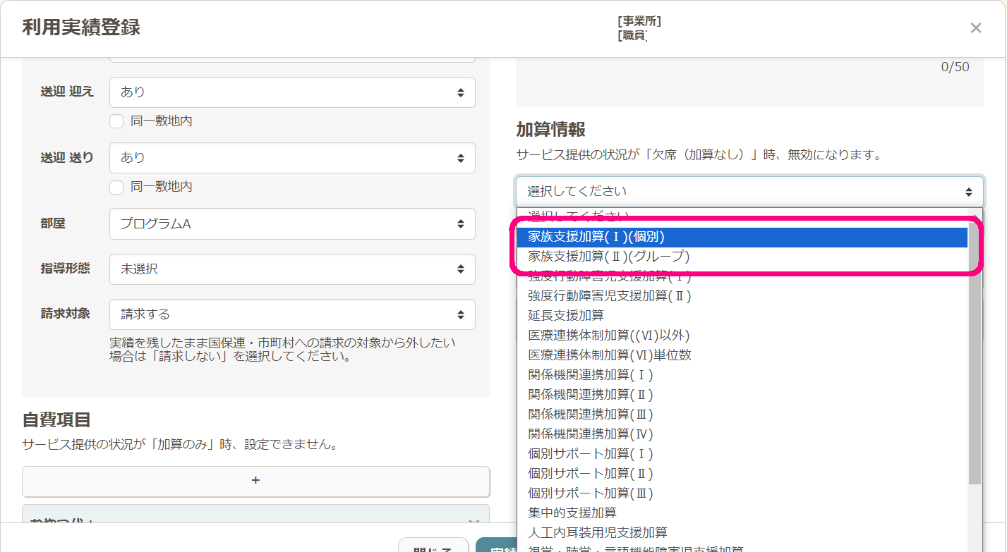 加算情報の下の+ボタンをクリックし、「家族支援加算」を追加し実績を作成します。