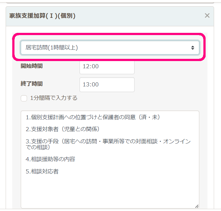 ※保育所等訪問支援にて算定する場合も、同様の操作となります。なお、保育所等訪問で家族支援加算のみを算定する場合は、こちらの記事を参照願います:保育所等訪問支援で家族支援加算のみの実績を登録したい