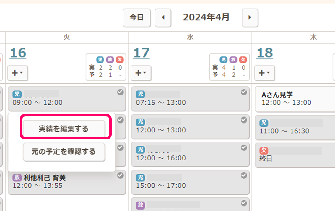 グローバルナビ【運営】から、【スケジューラ】をクリックし、該当児童をクリックして実績の編集画面を開きます。