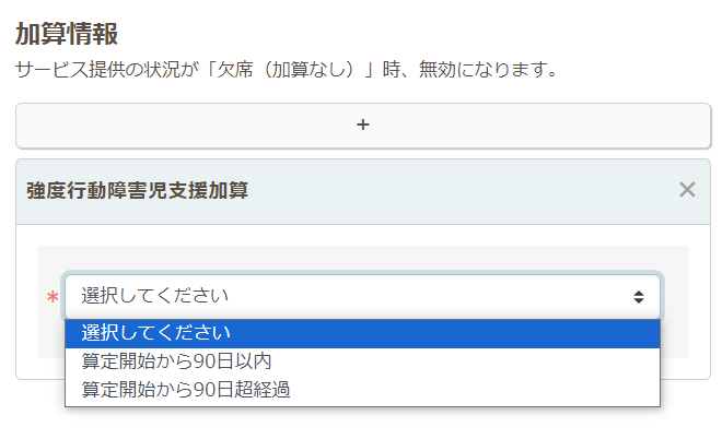加算情報の下の+ボタンをクリックし、「強度行動障害児支援加算」を選択します。