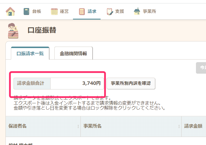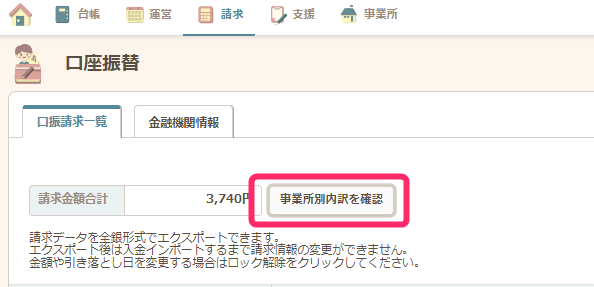 口座振替に必要な請求データは事業所毎ではなく、法人でまとまって一つの請求データが作成されます。請求金額の合計額や、事業所ごとの合計額を以下で確認できます。