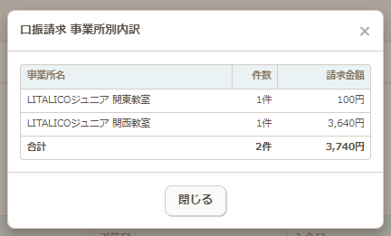 - 以下のように事業所ごとの件数と請求金額の合計が確認できます。
