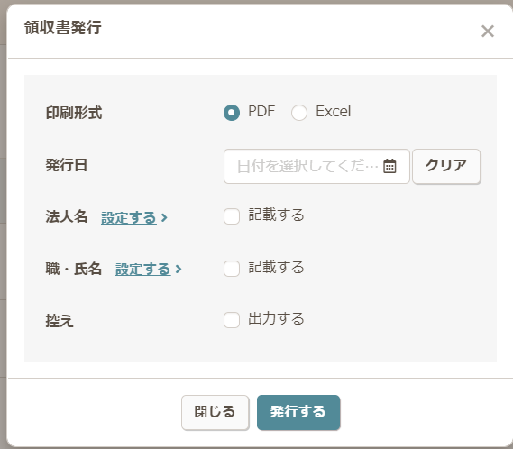 ・控えのチェックボックスにチェックを入れると、領収書の控えが出力されます。