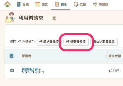 - 出力したい請求月で、保護者を選択し【領収書発行】をクリックします。
