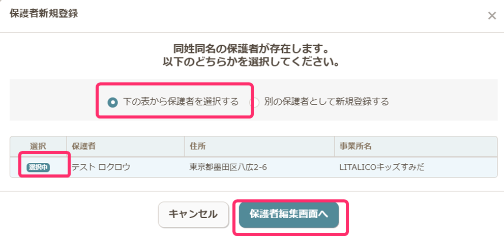 - 保護者名をカナ入力し【次へ】をクリックすると、以下のように他事業所で登録済みの情報が表示されます。名前を選択し【保護者編集画面へ】をクリックします。
