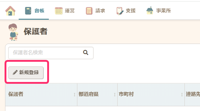- 【台帳】の【保護者】で【新規登録】をクリックします。