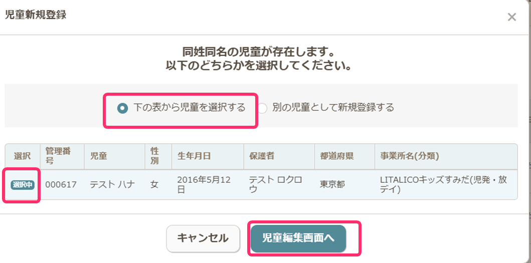 - 登録済みの保護者を選択し、児童名のカナ入力をし、【次へ】をクリックしすると、以下のように他事業所で登録済の情報が表示されます。名前を選択し【自動編集画面へ】をクリックします。