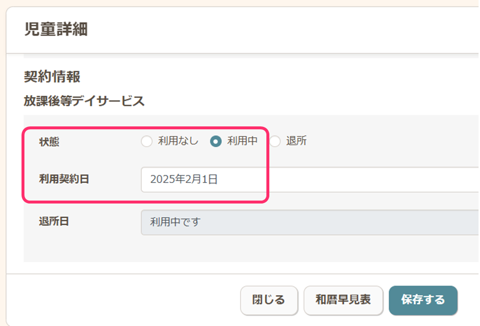 - 登録済みの児童詳細画面の表示されます。自事業所での利用契約日を入力して【保存する】をクリックします。