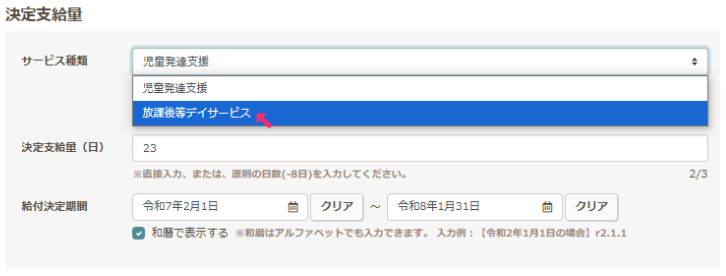 ※受給者証の登録画面の決定支給量>サービス種類「放課後等デイサービス」への変更をお忘れなきようお願いします。 - コピー登録後、受給者証一覧にてサービス種類が[放]で登録されていれば問題ありません。