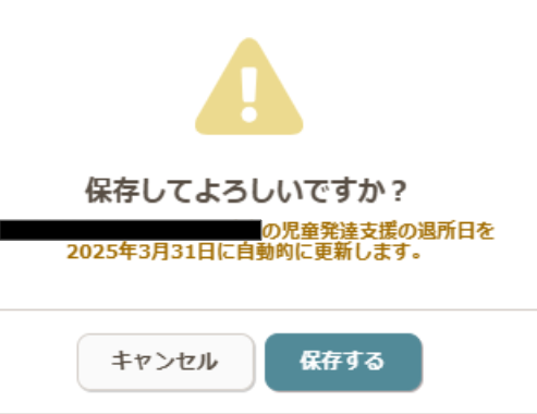 - 「児発の退所日を2025年3月31日に自動的に更新します。」と表示されるので【保存する】を選択ください。