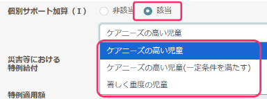 - 特記事項欄の個別サポート加算(Ⅰ)区分で「該当」を選択し、、必要に応じて区分も選び保存します。(児発には区分はありません)